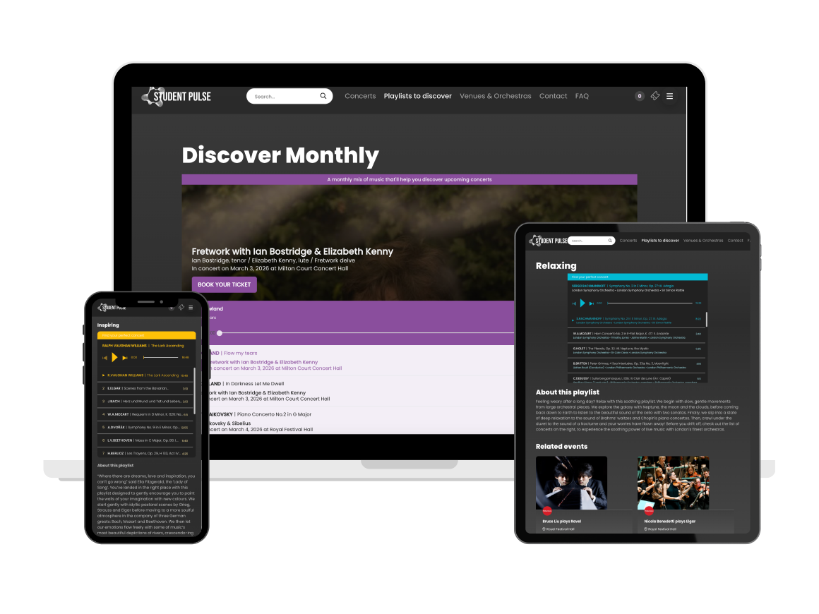 Student Pulse est la plateforme de billetterie à prix réduit conçue pour les étudiants londoniens. C'est le projet commun de 9 des principaux orchestres et salles de concert de Londres (LPO, RPO, Philharmonia, Barbican Centre, St John's Smith Square, BBC, Cadogan Hall, Southbank Centre, et le LSO). Lancé en 2013, c'était une manière de combiner les efforts marketing de ces institutions et de rassembler en une seule plateforme toutes les offres adressées aux étudiant(e)s.
